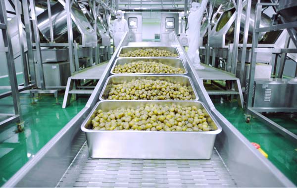 裹粉后的糖漬青梅被傳送在60米長(zhǎng)的一個(gè)通道,中間不能有任何的人為接觸,溫度從60度升到120度,在30分鐘之內(nèi),完成高溫滅菌。隨后進(jìn)入無(wú)菌冷卻車間,這兒要完成傳送帶降溫、兩次人工揀選、金屬探測(cè)儀檢測(cè)幾個(gè)環(huán)節(jié),才可以進(jìn)入包裝流水線。