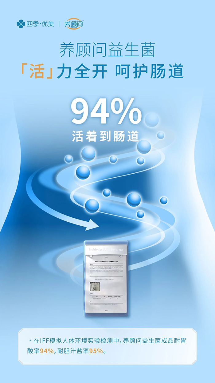 此次獲得權(quán)威認(rèn)證的養(yǎng)顧問益生菌不僅活菌率高,在IFF模擬人體環(huán)境實(shí)驗(yàn)檢測中,耐胃酸率高達(dá)94%,耐膽汁鹽率高達(dá)95%。“高活菌率+高耐胃酸率+高耐膽汁鹽率”,使養(yǎng)顧問“活菌優(yōu)等生”這一殊榮實(shí)至名歸。